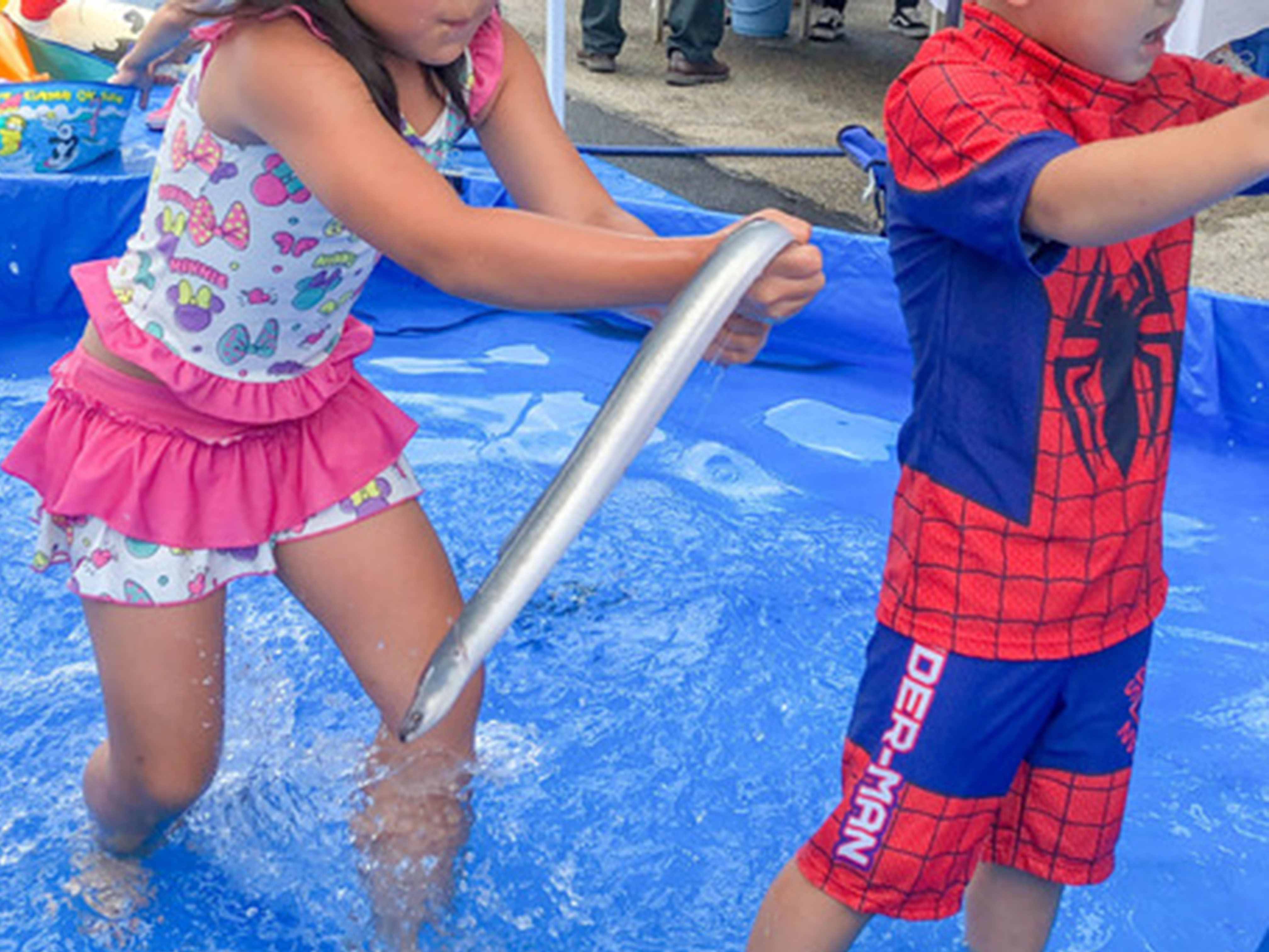 ウナギつかみは、山あいの川をせき止めたり、湖の施設を使用したりと、なかなか街中でできませんが、エアプールを使ってどこででも、ウナギつかみイベントをお届けします。