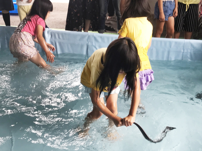 また、プールの中に入ってウナギを追いかけるのが無理な子供さんは、桶に入ったウナギに触ってもらえるコーナー設置も可能です