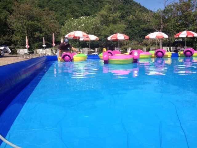 10メートルもしくは、7メートル四方のエアプールと 手漕ぎボートのパドラーボート